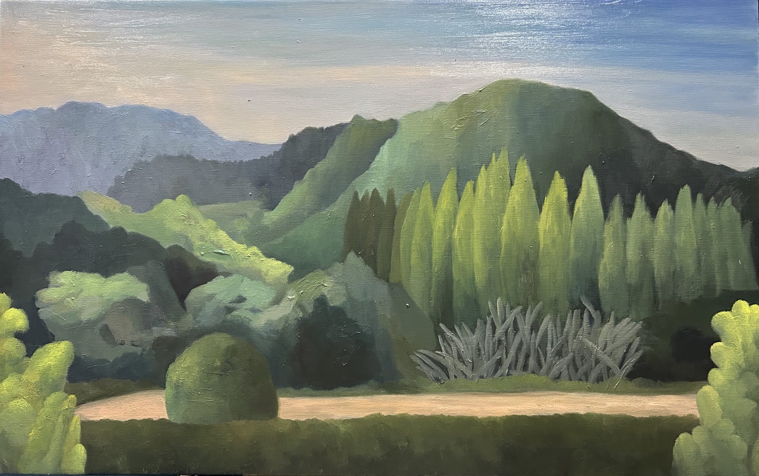 身近な風景を起点に描いたオイルパステル画や油絵を展示します。